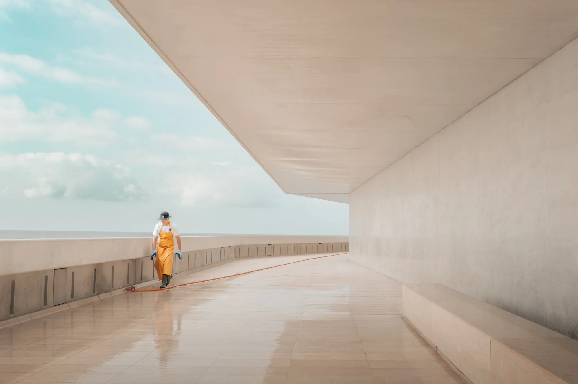A person in an orange apron and hat cleaning a concrete balcony or terrace with a hose, with a modern architectural structure and cloudy sky in the background.