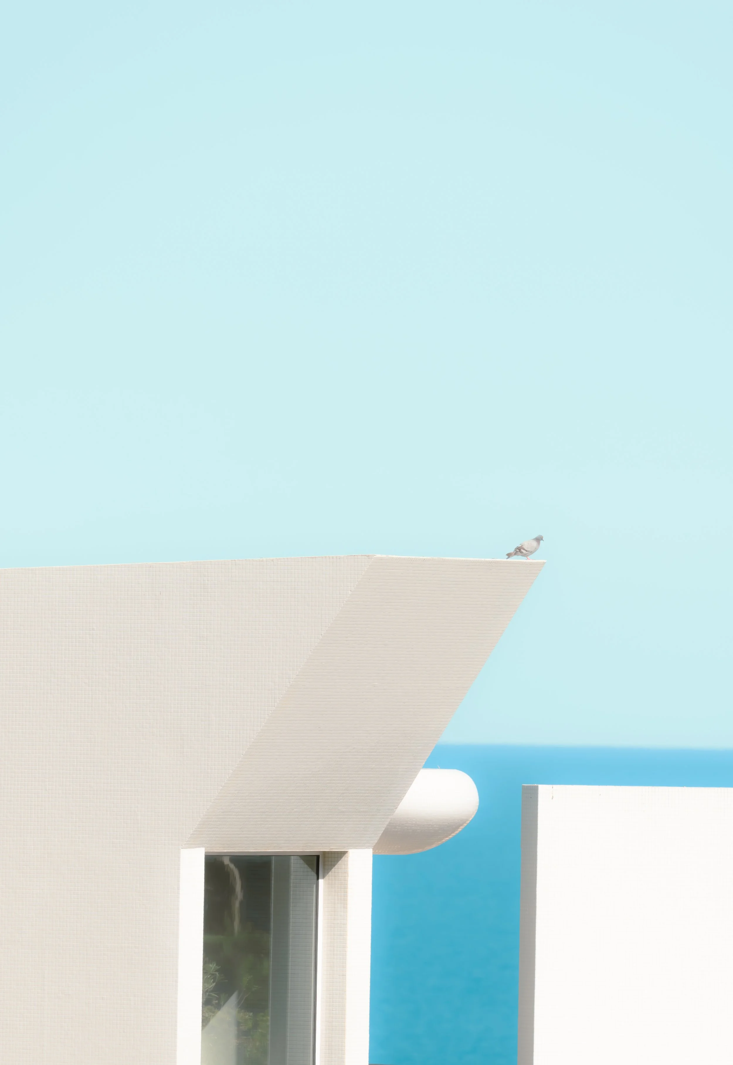 A modern white building with a geometric design, a large window, and a bird perched on the edge of the roof against a clear blue sky and ocean background. View fullsize